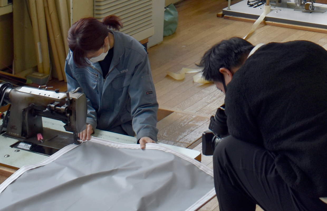 テント生地の縫製と言えば、ミシン(工業ミシン二本針)作業。取材カメラが寄っているのは縫い目の確認でしょうか。