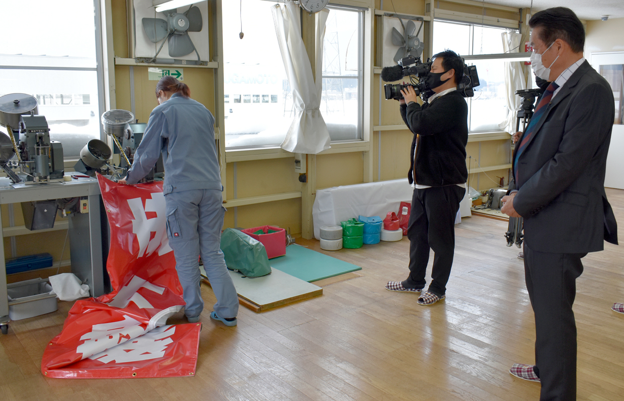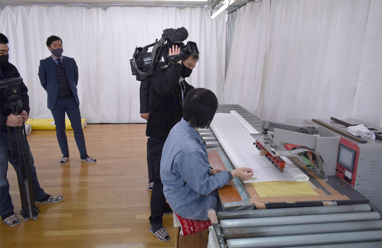 こちらは全自動ハトメ打ち機での作業風景の撮影。カメラが回っている緊張感の中、普段通り作業するのはなかなか大変な事だったようです。