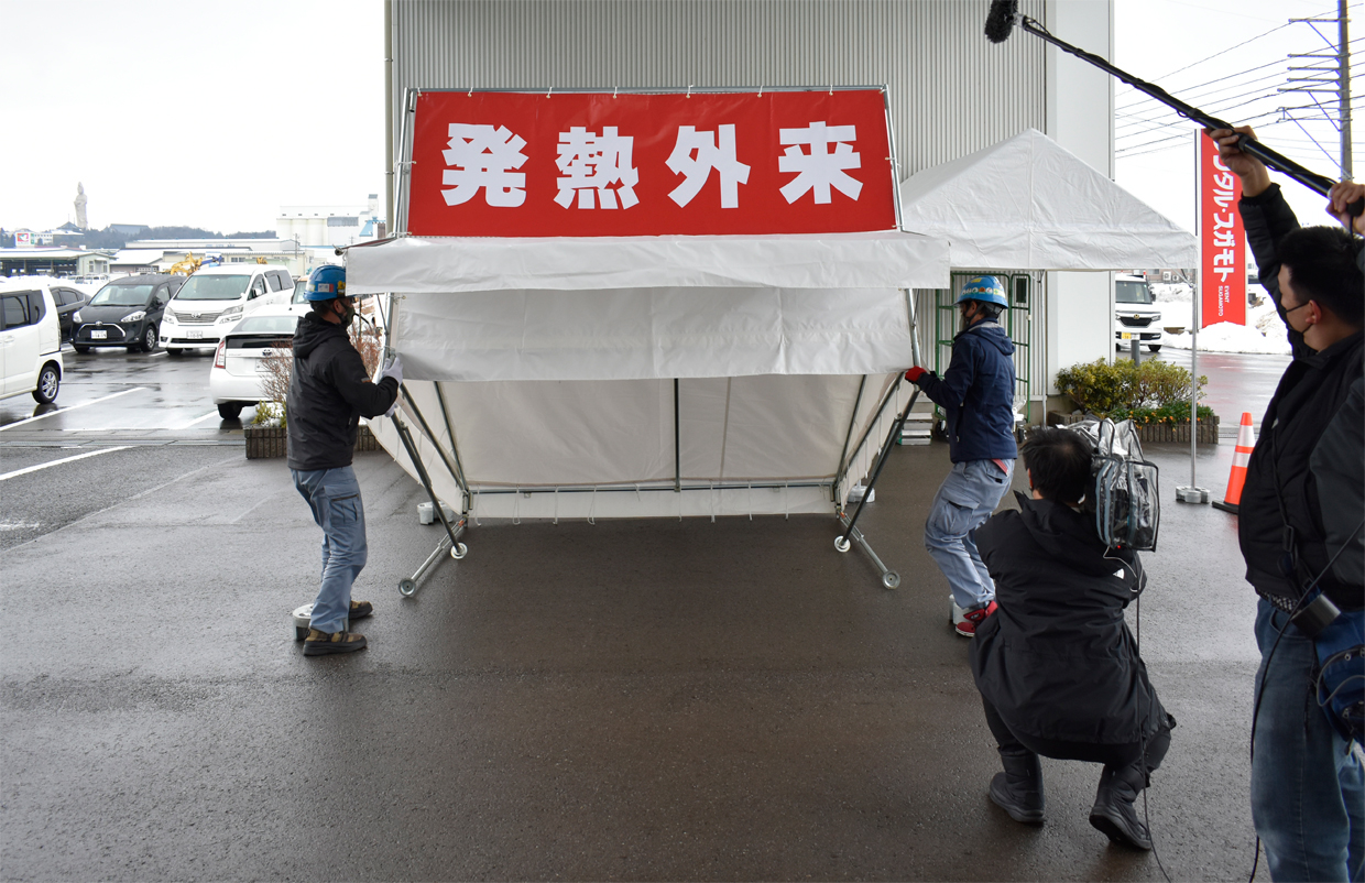 昨年12月に加賀市へ寄付させていただいた緊急受付テント「救護キーパーPCR検査仕様」の組立の様子を撮影中。