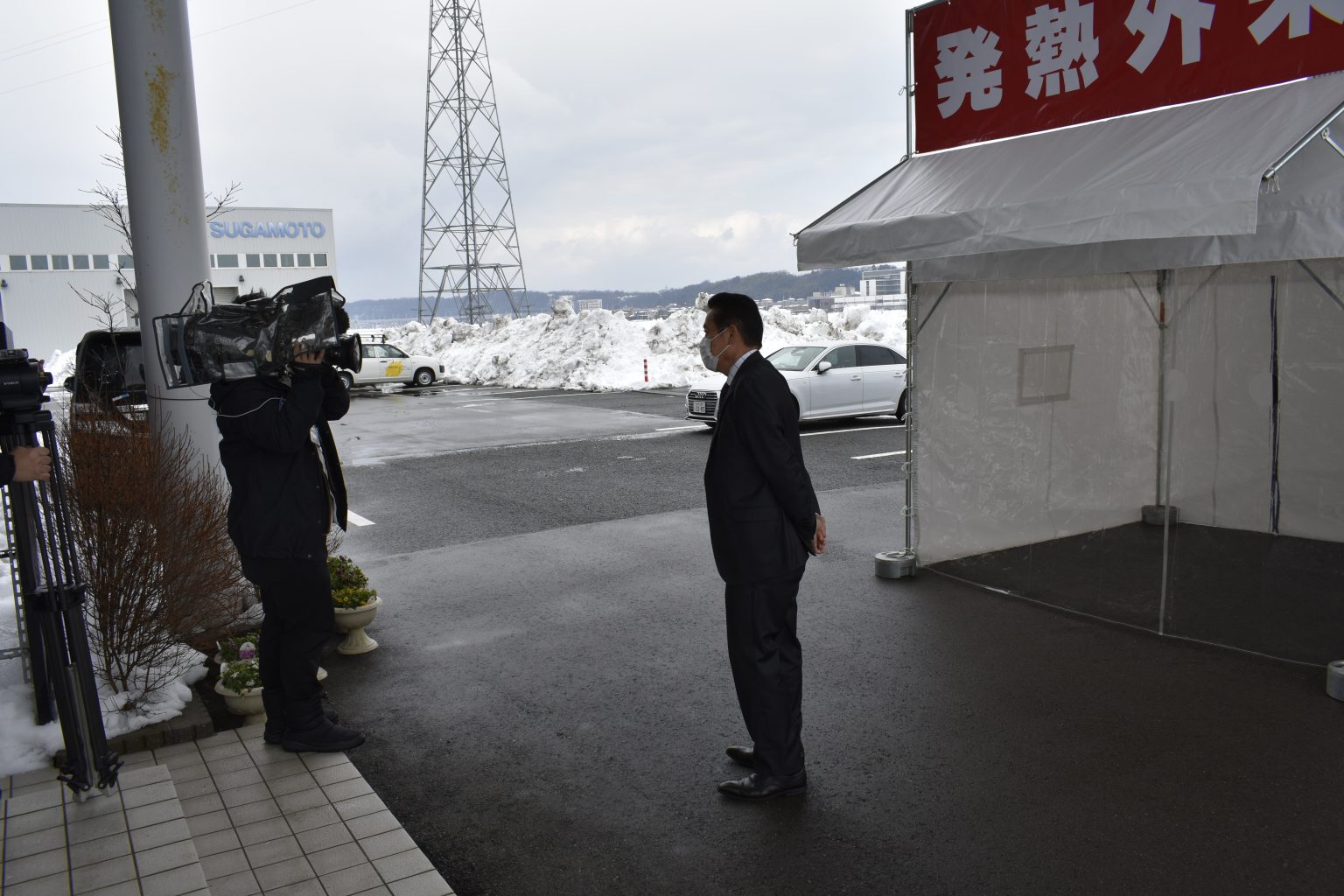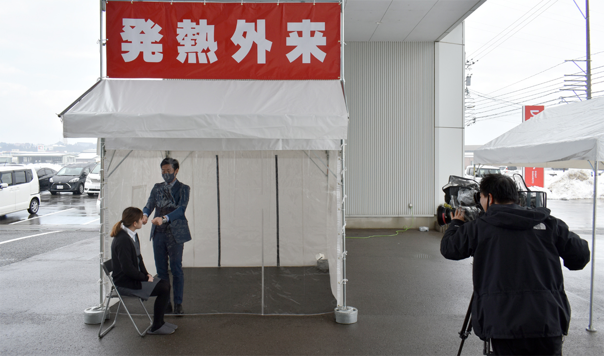 きっかけは、緊急受付テント「救護キーパーPCR検査仕様」を加賀市へ寄贈した際(2020年11月 寄贈式の様子が石川テレビで放映されました!)に取り上げていただいたご縁で、この度、2021年1月某日に石川県内の「コロナ禍で頑張る企業」として弊社を取材していただきました。