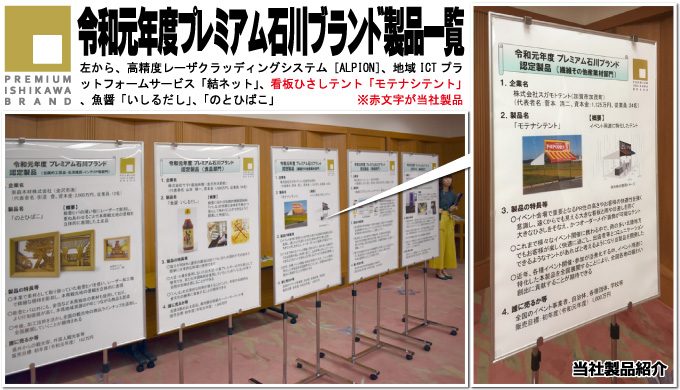 2019年7月4日に行われました令和元年度石川ブランド製品認定選考会に参加し、同年8月5日に、イベント特化型テントである看板ひさしテント「モテナシテント」が繊維その他資材部門にて最優秀賞(プレミアム石川ブランド認定製品)を受賞しました。